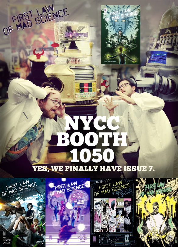 We’ll have copies of the First Law Of Mad Science trade, issue #6, as well as a brand new, limited to this con season only, Jim Mahfood variant cover for issue #1. Mike and I have been fans of Jim’s art for a long time, so it’s a tremendous honor to have him contribute to our comic.